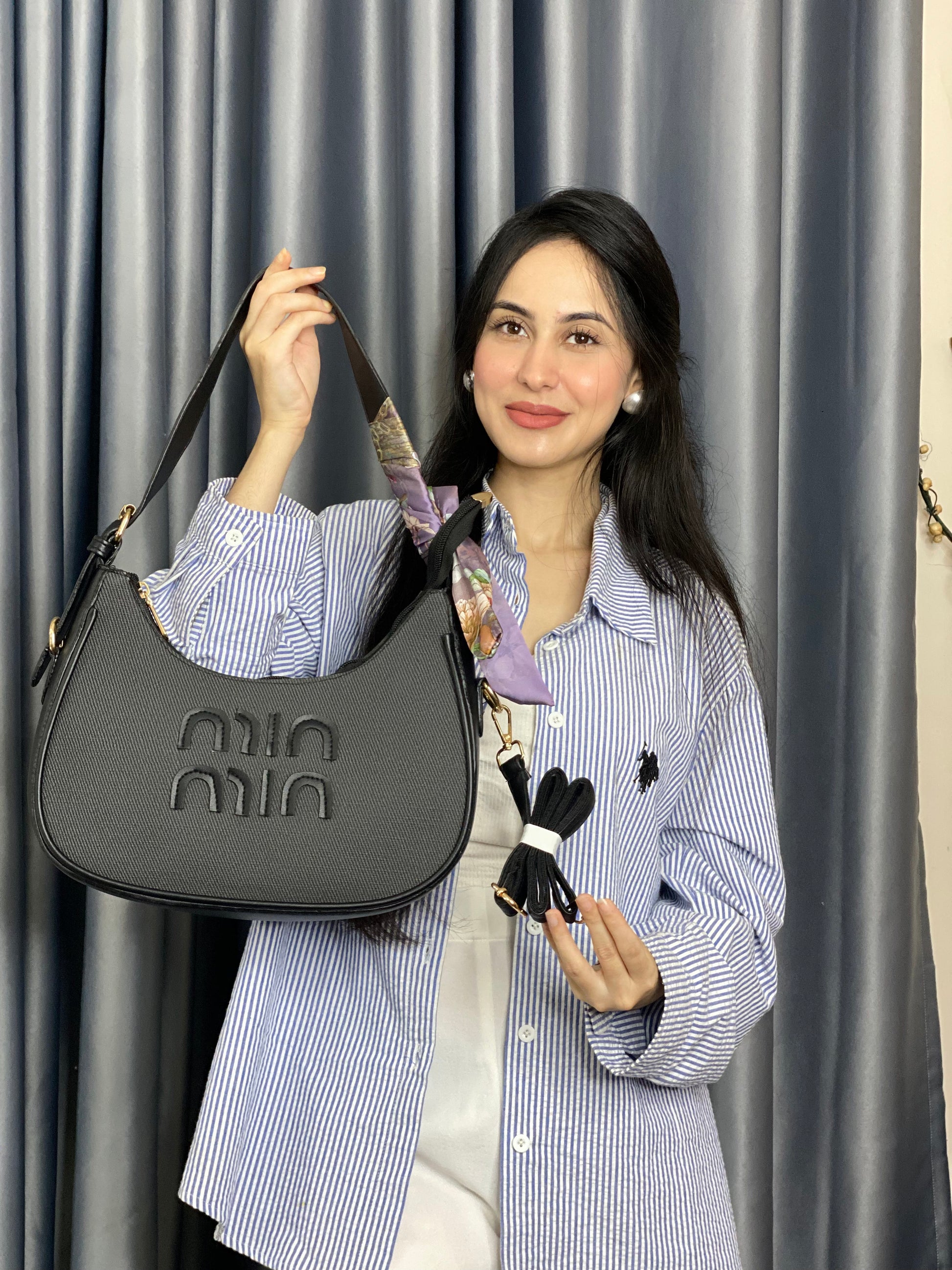 Black Textured Shoulder Bag with Scarf Detail